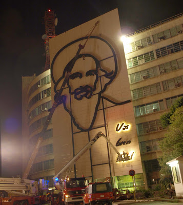 La noche del 27 de octubre de 2009, los técnicos instalan y prueban las luces interiores de las barras que conforman su silueta. Para huir de los "paparazzi", la instalación final de las luces se hizo en horas de la madrugada. Pero 10kbezas, como se firma el diseñador de La Calle, captó imágenes de las pruebas que se hacían con la caligrafía de Camilo. Aquí se las dejo.